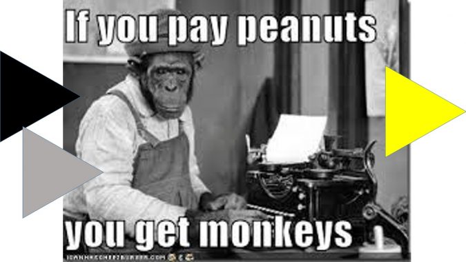 Your pay peanuts, you get monkey. Tidak hanya bermakna, bahwa jika Anda membayar dengan kacang akan mendapatkan monyet. Lebih jauh bermakna, jika seorang pimpinan tidak menghargai keahlian anakbuahnya, termasuk senioritas dan kepatutan lainnya. Misalnya dalam promosi dan mutasi jabatan dalam organisasi itu. Sebenarnya itu adalah bagaimana pimpinan organisasi itu, sedang memamerkan kualitas dirinya kepada khalayak. Semacam pengumuman ke public, bahwa organisasi itu hanya dipimpin oleh seseorang dengan kualitas kacangan. Alias amatir. Parah kan?